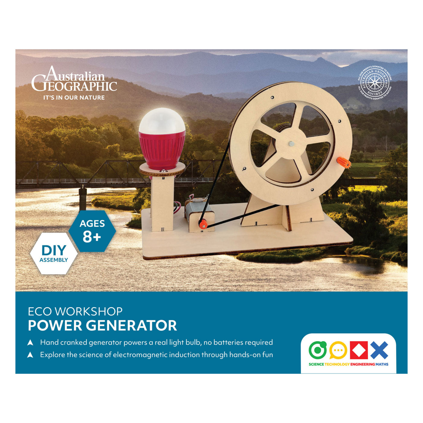 The Australian Geographic Eco Workshop Power Generator invites children to explore the fascinating world of electricity through practical, hands-on learning. With this STEM kit, builders can construct a working generator that produces power without batteries or plugs. By simply turning the crank, the generator creates electricity to light up the included bulb, showing learners the principles of electromagnetic induction in action.