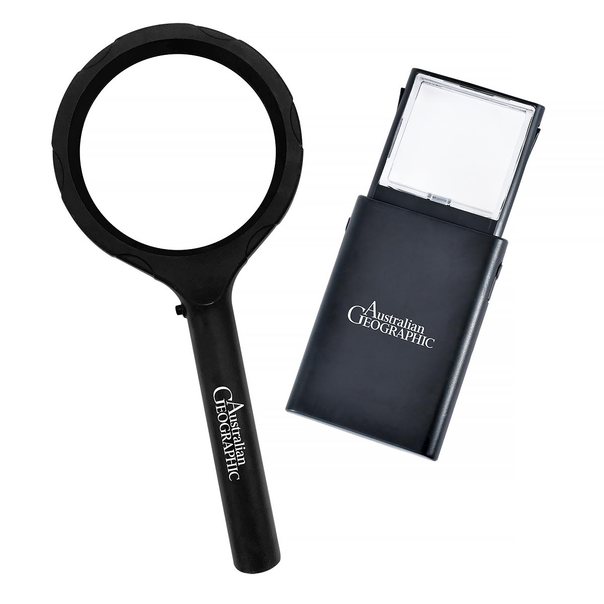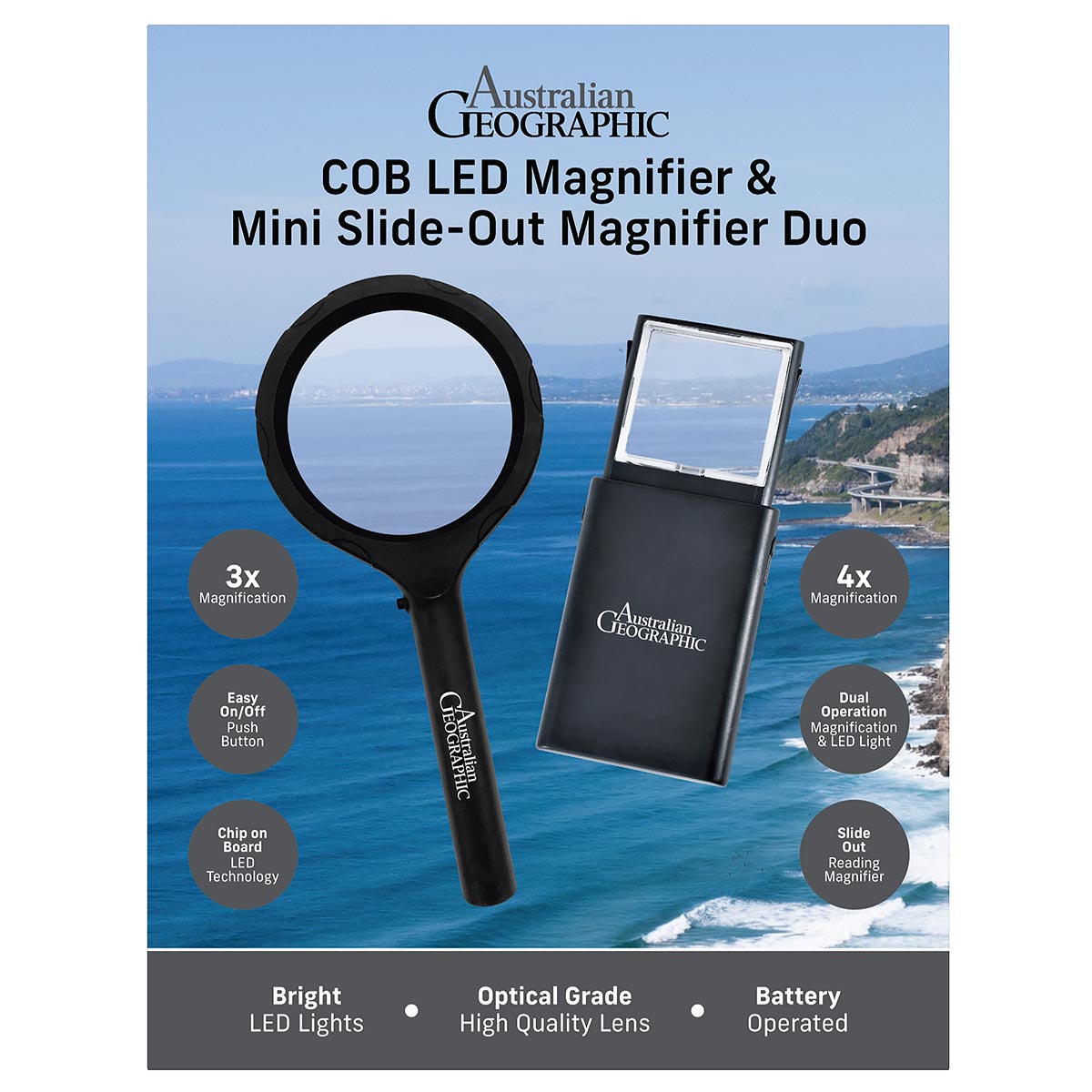 Discover the convenience and clarity of the Australian Geographic LED & Mini Magnifier Duo. This practical set features two high-quality optical grade magnifiers equipped with bright LEDs to simultaneously illuminate and magnify, making it perfect for a variety of tasks.