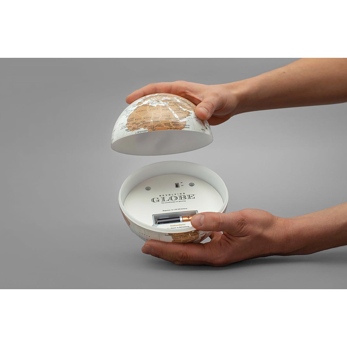 The globe rotates fully every 14 seconds, giving you a smooth and continuous spin. Powered by an AA battery (not included), it’s a perfect blend of functionality and style for your workspace.